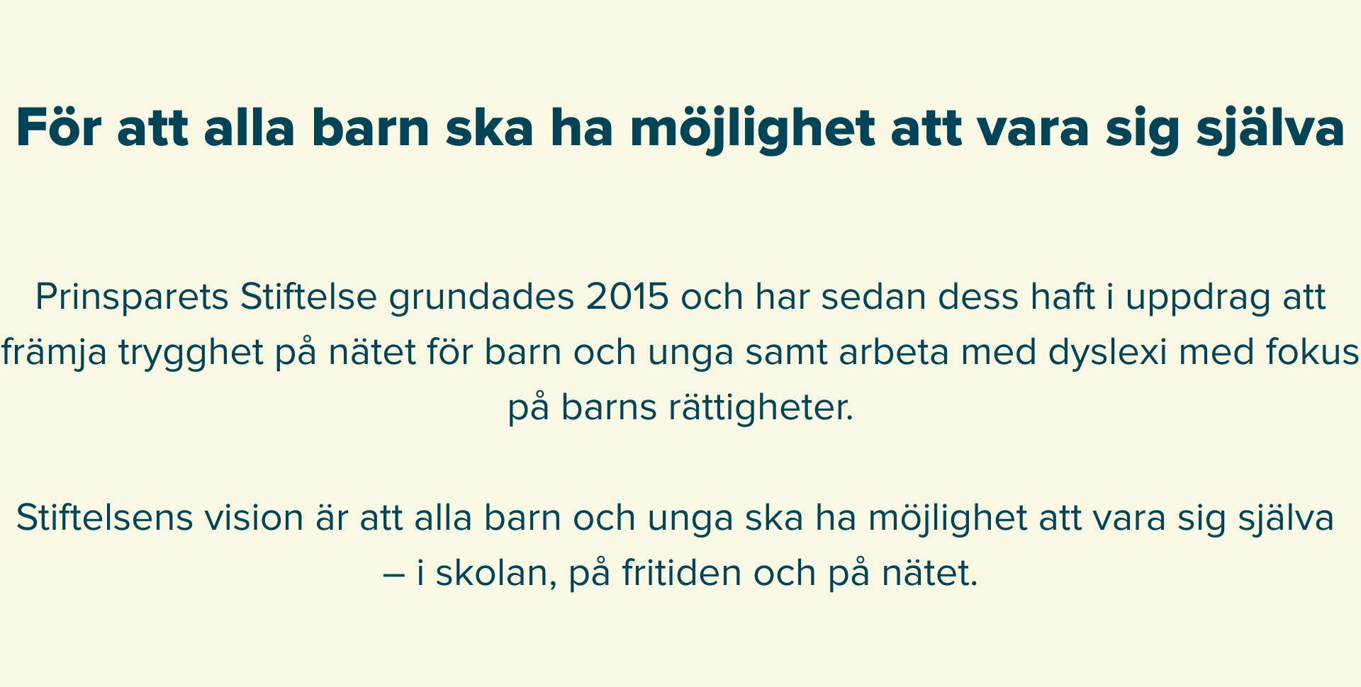 Barn lever idag ett liv där gränsen mellan det fysiska och det digitala inte längre existerar. Prinsparets Stiftelse arbetar för att säkerställa barns rättigheter och deras möjlighet att vara trygga oavsett var de befinner sig genom förebyggande och främjande insatser. Genom våra sektorsövergripande satsningar som Lajka, Näthatshjälpen och NOCTA är vi, tillsammans med andra en viktig aktör i arbetet för en tryggare tillvaro för barn på nätet.