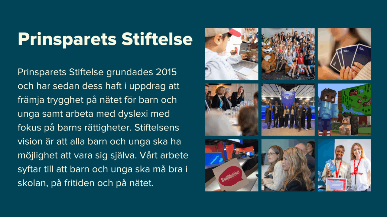 Barn lever idag ett liv där gränsen mellan det fysiska och det digitala inte längre existerar. Prinsparets Stiftelse arbetar för att säkerställa barns rättigheter och deras möjlighet att vara trygga oavsett var de befinner sig genom förebyggande och främjande insatser. Genom våra sektorsövergripande satsningar som Lajka, Näthatshjälpen och NOCTA är vi, tillsammans med andra en viktig aktör i arbetet för en tryggare tillvaro för barn på nätet.