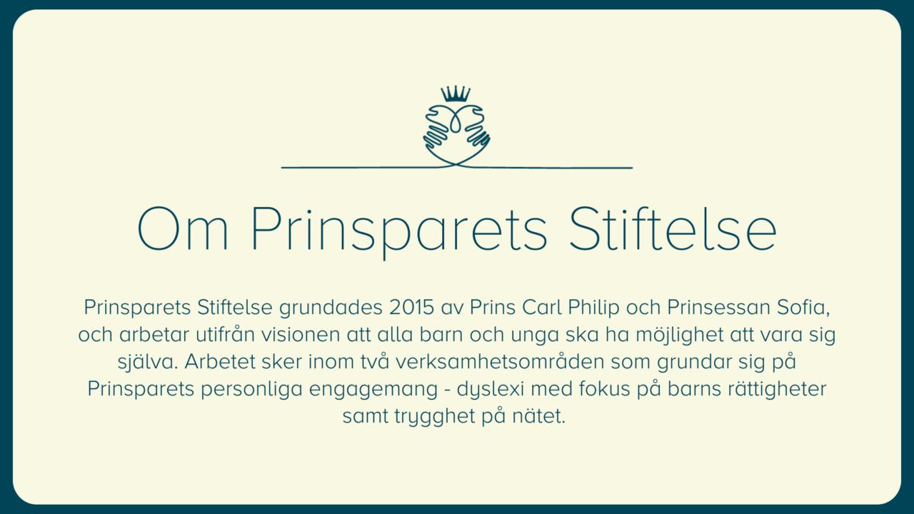 Ett av Prinsparets Stiftelses verksamhetsområden är dyslexi med fokus på barn rättigheter. Dyslexi och läskunskap hänger ihop med demokratiska rättigheter. Prinsparets Stiftelse arbetar därför läsfrämjande, för att säkerställa att fler kan delta i det demokratiska samtalet. Vi arbetar även för tidig upptäkt och tidiga insatser för att se till att alla barn får den likvärdiga utbildning de har rätt till. Med vårt arbete vill vi stärka läsförtroendet och läskunskapen hos barn genom att inspirera bland annat genom goda exempel och förebilder sprunget ur dyslexi som är vår hjärtefråga.